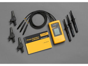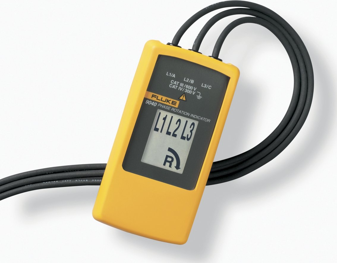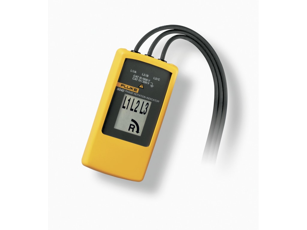 The Fluke 9040 is effective for measuring phase rotation in all areas where three phase supplies are used to feed motors, drives and electrical systems. The Fluke 9040 is a rotary field indicator and can provide clear indication of the 3 phase via an LCD display and the phase rotation direction to determine correct connections. It allows rapid determination of phase sequence and has a voltage (up to 700 V) and frequency range suitable for commercial and industrial applications. The included test probes have a variable clamping range for safe contact, also in industrial sockets.